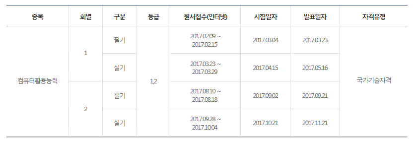 2017년 컴퓨터활용능력 정기시험 일정