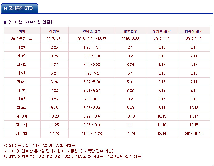 2017년 GTQ 정기시험 일정